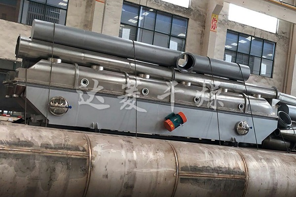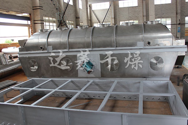 產品概述:物料自進料口進入機內,在振動力作用下,物料沿水平流化床拋擲,向前連續運動,熱風向上穿過流化床同濕物料換熱后,濕空氣經旋風分離器除塵后由排風口排出,干燥物料由排料口排出。