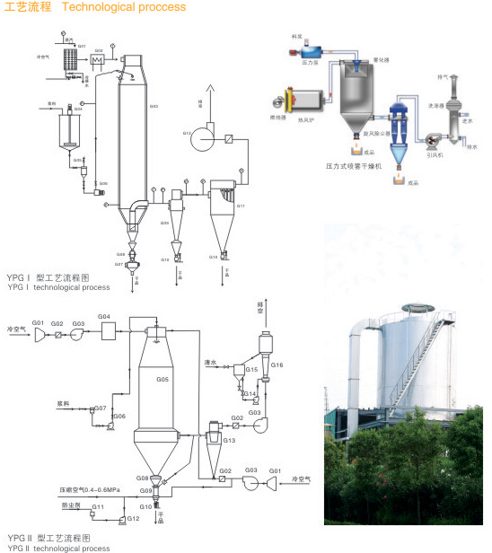 產品概述:壓力式噴霧干燥造粒機是采用壓力式霧化器借助隔膜泵的壓力將溶液或漿狀的物料霧化成