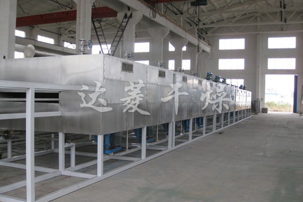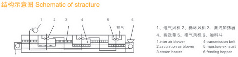 物料由加料器均勻地鋪在網(wǎng)帶上,網(wǎng)帶一般采用12-60目不銹鋼絲網(wǎng),由傳動裝置拖動在干燥機內移動。干燥機由若干單元組成,每一單元熱風獨立循環(huán),部分尾氣由專門排濕風機排出,廢氣由調節(jié)閥控制,熱氣由下往上或由上往下穿過鋪滿物料的網(wǎng)帶完成熱量與質量傳遞的進程,帶走物料水份。網(wǎng)帶緩慢移動,運行速度可根據(jù)物料溫度自由調節(jié),干燥后的成品連續(xù)落入收料器中。上下循環(huán)單元根據(jù)用戶需要可靈活配備,單元數(shù)量亦可根據(jù)需要選取。